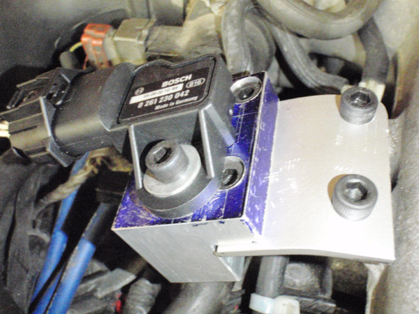 With that done, it was time to fab up a more permanent temporary adaptor. The final location will be a boss welded directly into the manifold plenum, so as to get the most accurate pressure and temperature values (and eliminate a hose). But until then, this adaptor will do fine, especially as I'm not reading the temperature value just yet.